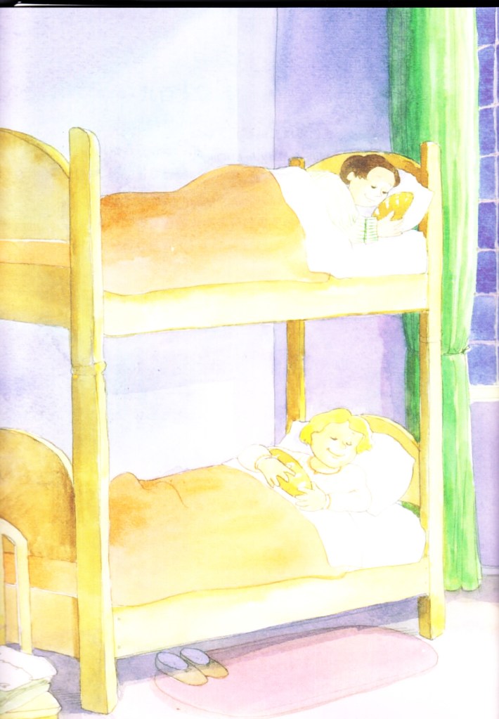 有趣的書名始於二次世界大戰一個扎心又窩心的故事。那時,成千上萬的兒童飽受戰火洗禮,被安置在難民營中,身心受創難以入眠,活在恐慌中。有人想到一個方法:每晚睡前給孩子拿著一塊麵包,讓他們與麵包同眠,等於向他們傳達一個訊息:「今天我吃飽了,明天我還會有得吃。」
