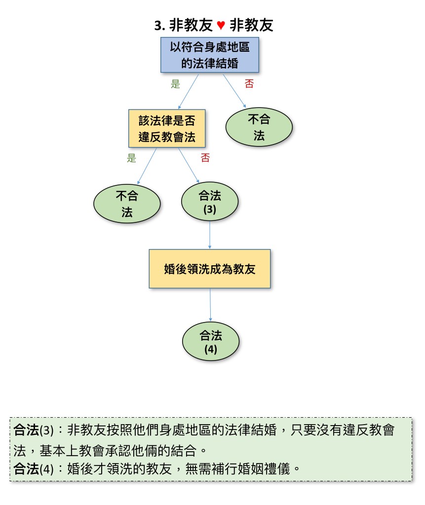 答:為非教友來說,不符合當地法律的婚姻是不合法;為教友來說,如果不能符合教會對婚姻儀式的要求,婚姻同樣是不合法。舉例來說,教友與非教友結婚,自行到政府婚姻登記處宣誓結婚,這為當地法律上來說,是合法婚姻,為教會法來說,並不合法,這對新人並沒有真的結婚。(參閱圖一、圖二)