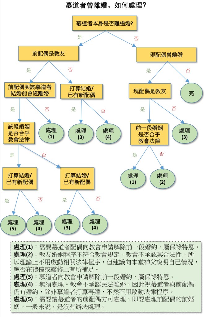 答:教會法有「特恩」的規定,指在非聖事性婚姻裡,因信仰的緣故,可以讓人解除前婚約,開始另一段婚姻。關鍵是在於「信仰」。